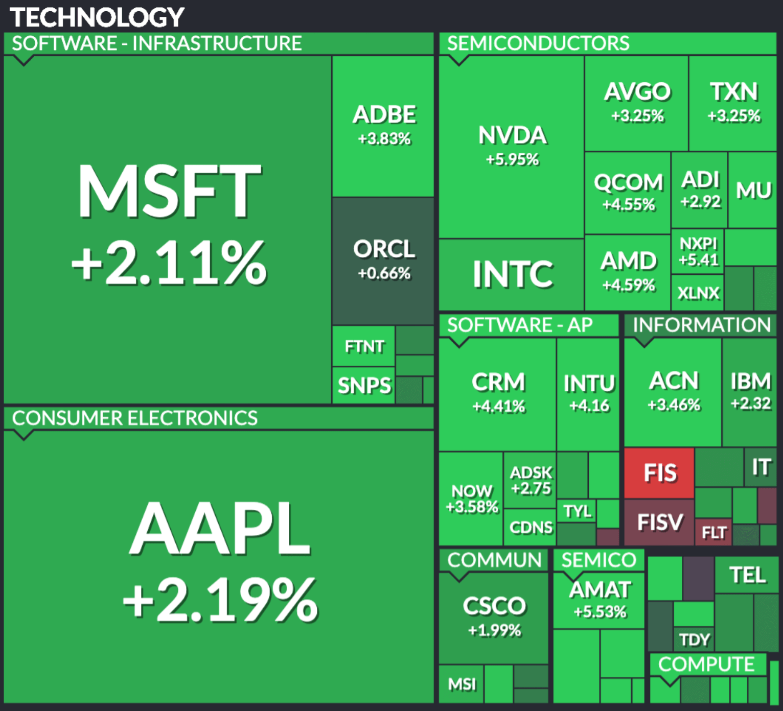 핀비즈 맵은 주가가 하락하면 빨간색으로 표현되고, 반대로 주가가 상승하면 녹색으로 표현됩니다. 상승과 하락 비율에 따라서 색상의 진함이 변하는 것도 알 수 있습니다.