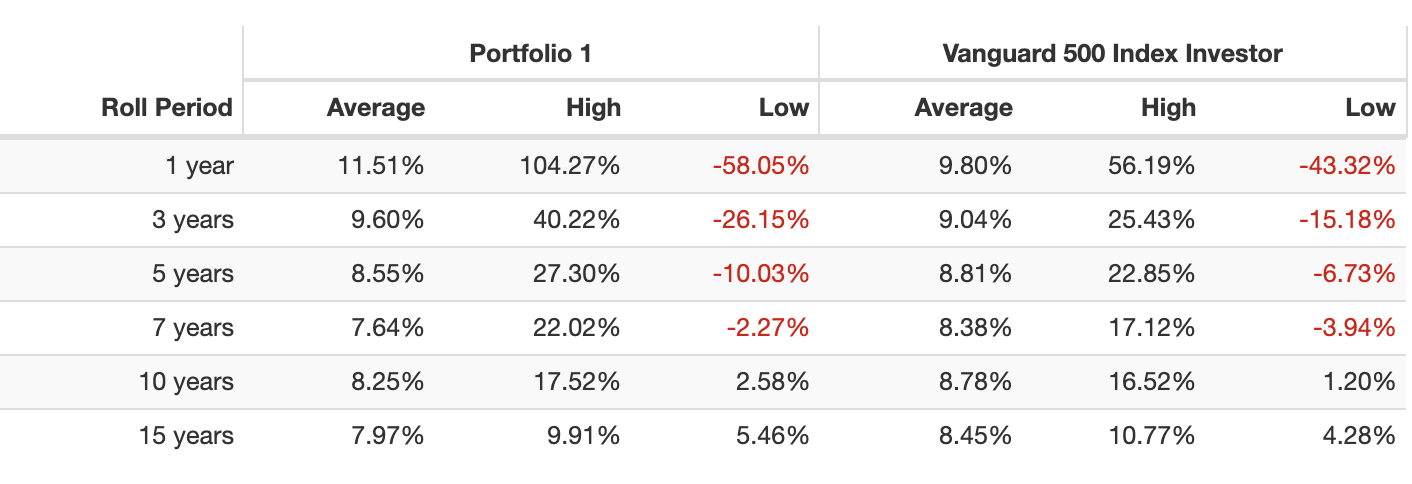 롤링리턴(Rolling Return)이란 n년 수익률 분포를 뜻합니다. 롤링리턴을 통해 가장 수익이 좋았던 n년과 가장 수익이 안좋았던 n년 투자 수익의 평균값을 확인할 수 있습니다.