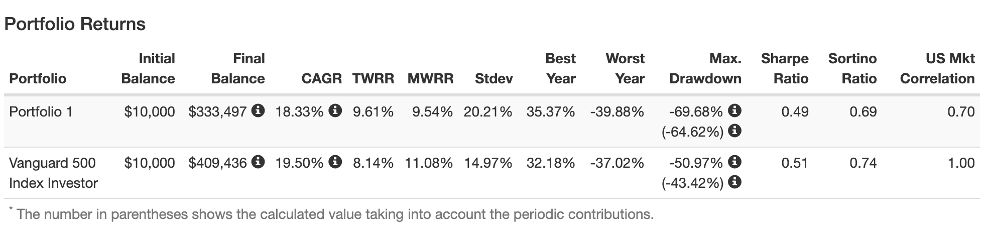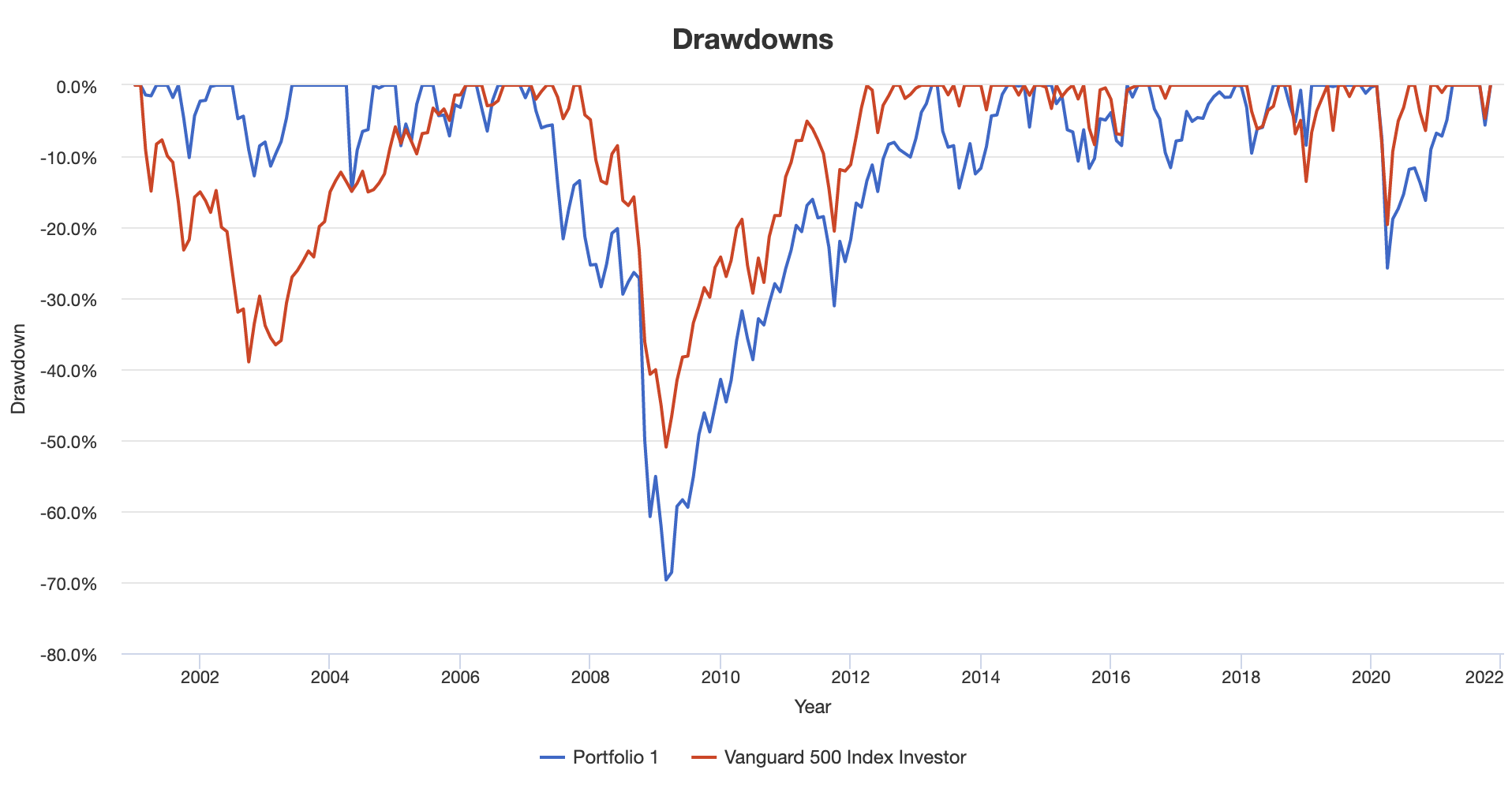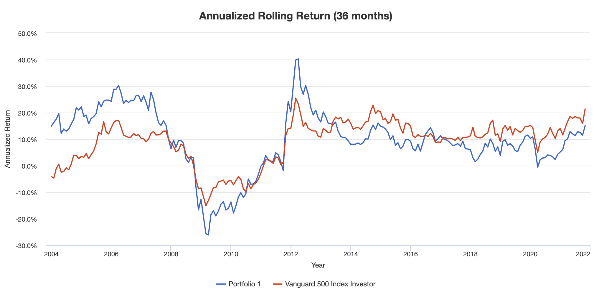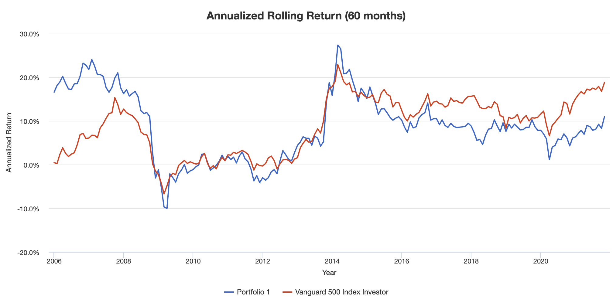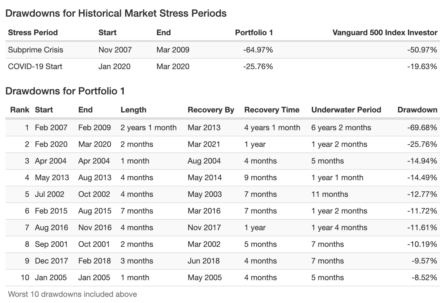 최근 S&P 500 인덱스 퍼포먼스가 어마어마하기 때문에 최근에는 S&P 500 인덱스보다 수익률을 하회하는 모습을 보여주고 있지만, 이전부터 꾸준히 S&P 500을 상회하는 좋은 퍼포먼스를 보여주고 있었던 것을 확인할 수 있습니다. 서브프라임 모기지 사태가 오기 전과 후를 봐도 수익률이 압도적이네요.