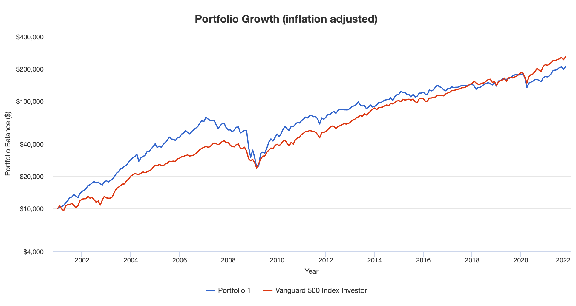 인플레이션을 반영한 IYR의 총 수익은 $209,801(한화 2억 5,008만원)의 수익을 냈습니다. 반면에 같은 기간 S&P500 인덱스에 적립식으로 투자했을 때 수익률은 $257,573(한화 3억 702만원)으로 S&P 500 인덱스가 좋은 퍼포먼스를 보여줍니다. 하지만 IYR 또한 꾸준히 우상향함으로써 굉장히 좋은 성과를 보였다고 판단할 수 있습니다.