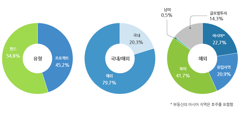 우리나라 연기금도 포트폴리오에 대체투자 상품을 15%이내로 운용하는 것을 목표로 하고 있습니다. 심지어 전체 부동산 자산 중 해외 비중이 80%로 국내보다는 해외 부동산 자산에 집중적으로 투자하고 있는 것을 확인할 수 있습니다. 이처럼 불확실한 미래에 대응하기 위해 주식 외에 대체투자 자산으로 부동산을 편입해서 운용하는 것이 안정적인 투자방법이라고 생각합니다.