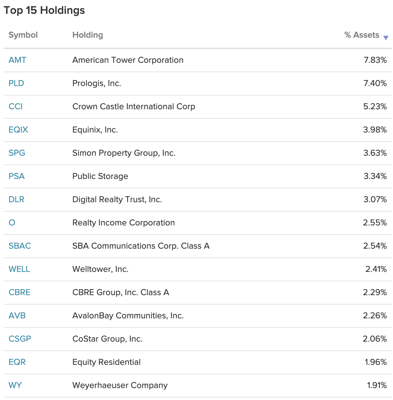 IYR ETF는 현재 90개의 리츠에 분산투자하고 있으며, 포트폴리오 상위 15개 기업은 아래와 같습니다. ETF 특성상 리밸런싱 주기마다 해당 포트폴리오 비중과 종목이 변경될 수 있기 때문에 투자 전 꼭 다시 확인 후 투자하시기 바랍니다.