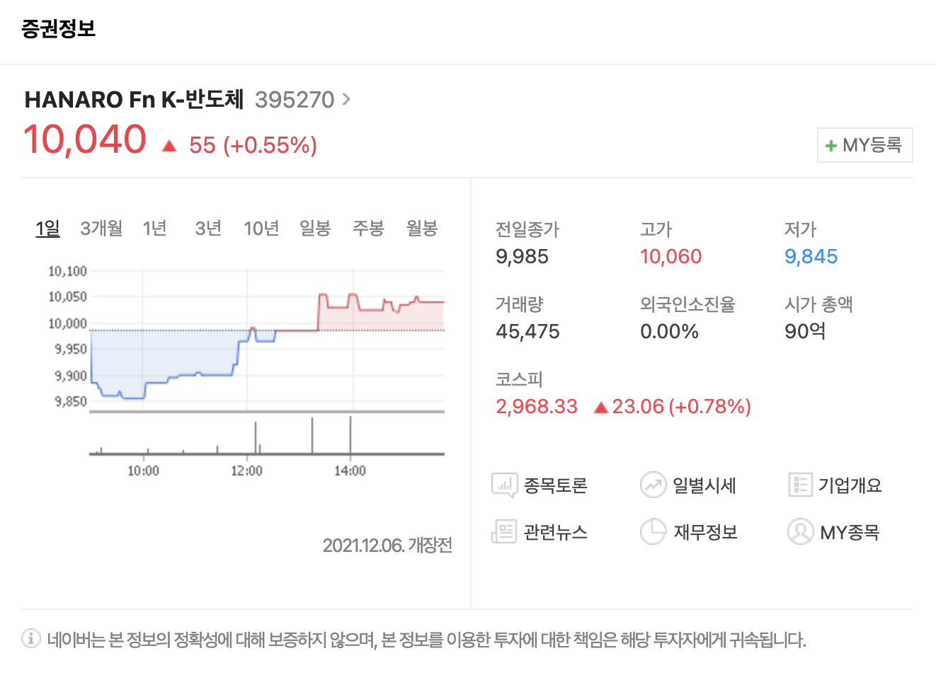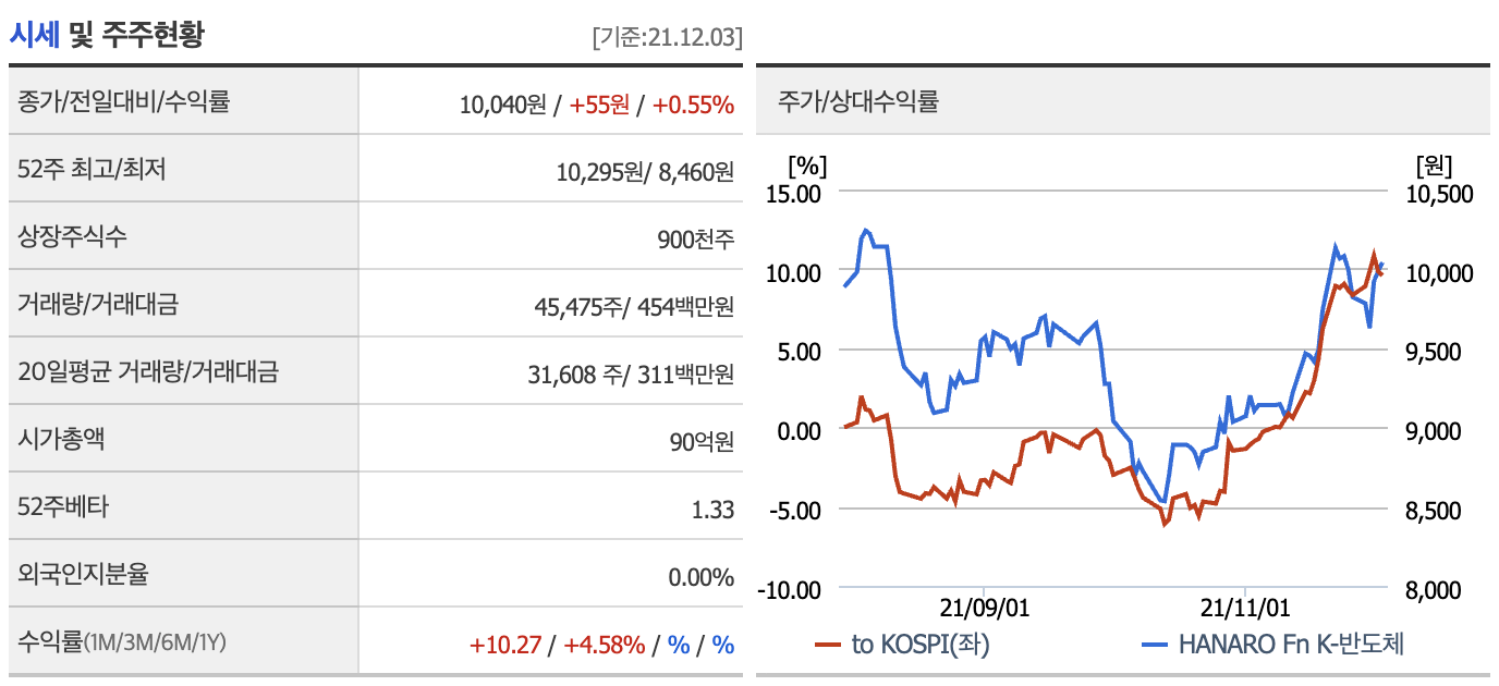 반도체 테마는 요즘 꽤 흥행하는 테마임에도 불구하고 해당 ETF의 거래량이 굉장히 낮은 것을 확인할 수 있습니다. 이러한 테마성 ETF는 어느순간 관심이 시들해지면 거래량이 풀썩 주저앉을 수 있으니 투자하실 때 유의하시기 바랍니다. 그리고 HANARO Fn K-반도체는 현재 기준(21.12.06) 상장된지 반년도 안됐기 때문에 각종 위기에 어느정도 변동성이 있을지 예측이 되지 않습니다. 반도체 관련 ETF 상품중에 가장 거래량이 저조하고 시가총액도 90억원으로 관심이 시들해지면 ETF 상장폐지 가능성도 염두해야될 정도로 작은 규모입니다. 솔직히 비추천드리고 싶습니다.