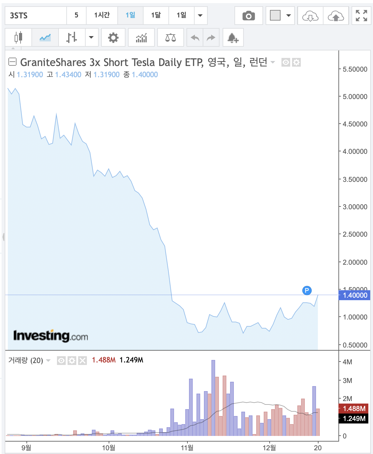 테슬라 3배 숏 상품의 정식 명칭은 GraniteShares 3x Short Tesla Daily ETP이고 티커는 3STS입니다. 3STS는 12월 21일 기준 하루에 18.49% 수익률을 보이고 있습니다. 이 타이밍에 테슬라 3배 숏을 칠 수 있는 당신은... 야수의 심장 인정합니다.